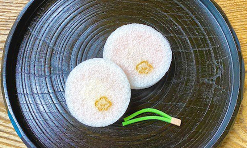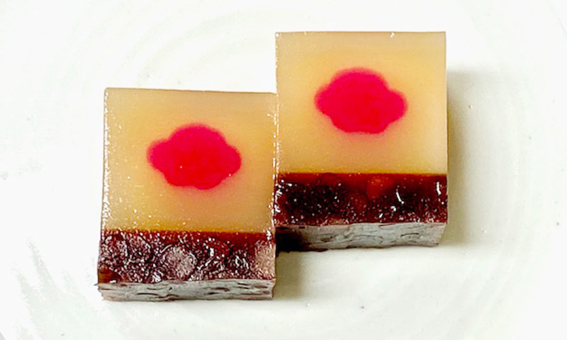 落雁の生地に梅肉を合わせ、表面に梅の枝に見立てた模様を入れる。